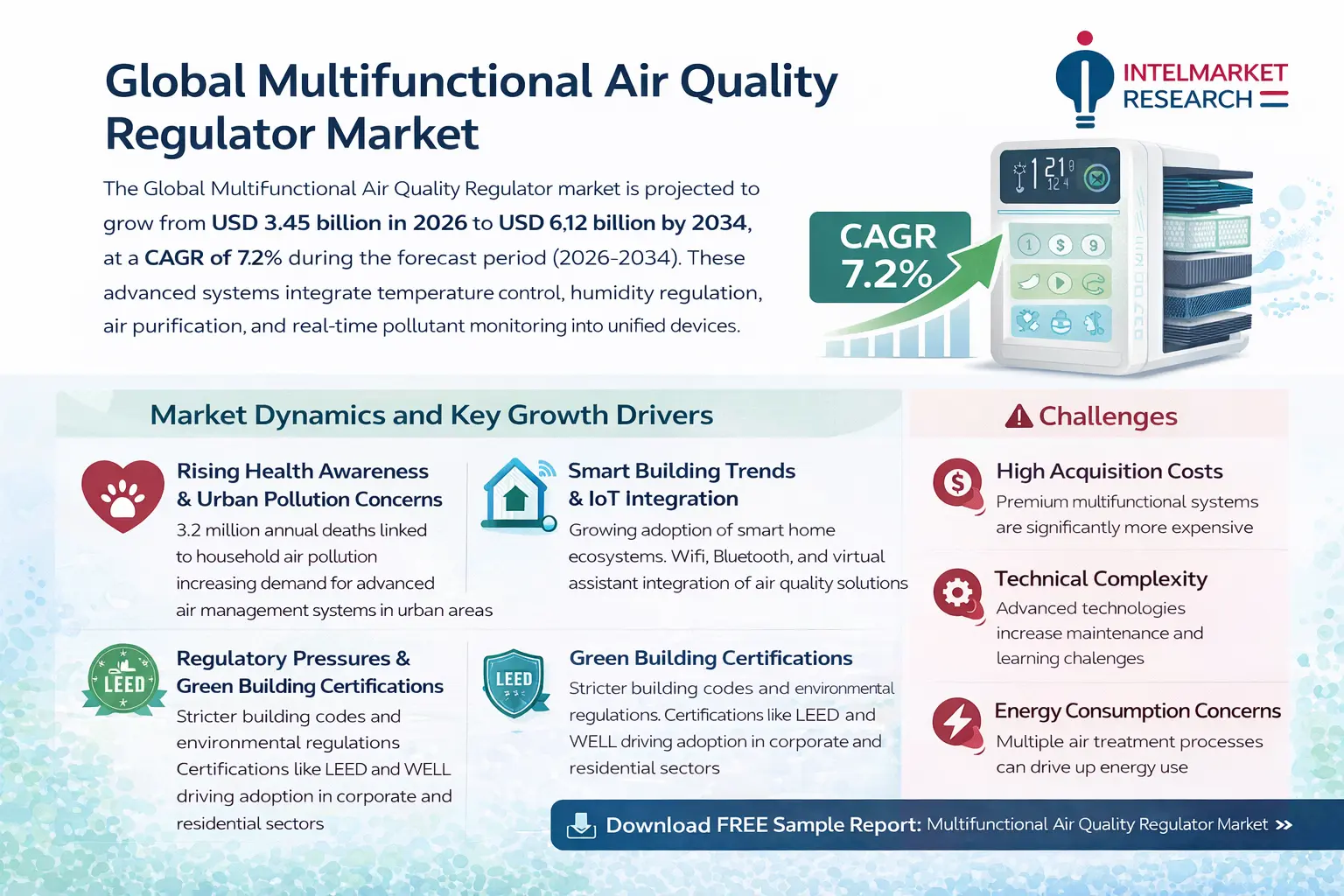 According to latest research from Intel Market Research,Global Multifunctional Air Quality Regulator market was valued at USD 3.45 billion in 2025 and is projected to reach USD 6.12 billion by 2034, growing at a steady CAGR of 7.2% during the forecast period (2026-2034). This growth trajectory reflects the increasing global demand for comprehensive air quality management solutions that combine multiple environmental control functions into single integrated systems.