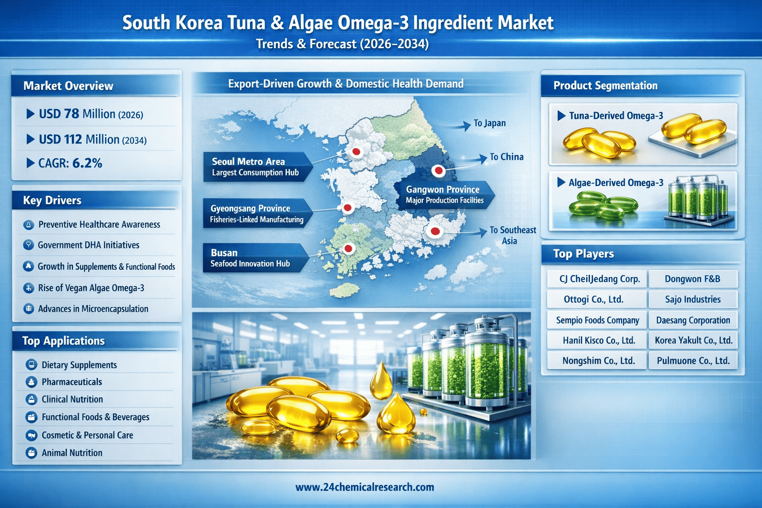 South Korea’s Tuna and Algae Omega-3 Ingredient Market is poised for strong growth, expanding from USD 78 million in 2026 to approximately USD 112 million by 2034, registering a 6.2% CAGR, according to 24Chemical Research.
