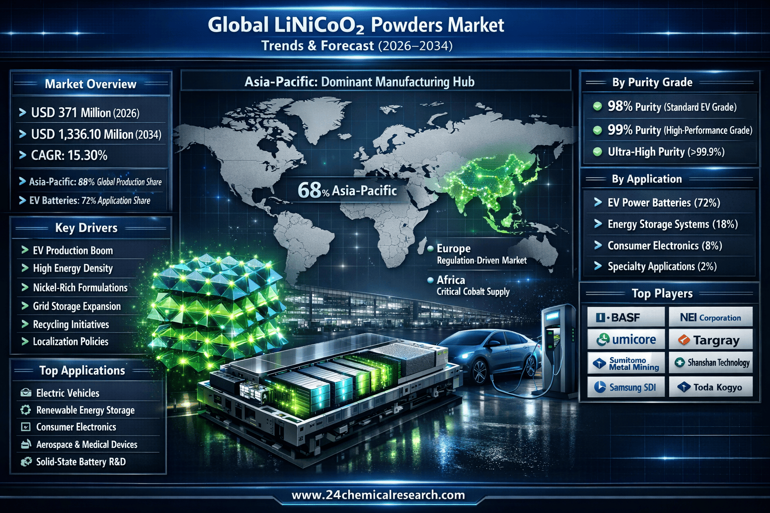 Global LiNiCoO₂ Powders Market to Reach USD 1,336.10 Million by 2034, Growing at a 15.30% CAGR According to 24Chemical Research, global LiNiCoO₂ (Lithium Nickel Cobalt Oxide) powders market is projected to expand from USD 371 million in 2026 to USD 1,336.10 million by 2034, registering a strong CAGR of 15.30%. The surge is primarily driven by accelerating adoption of lithium-ion batteries across electric vehicles (EVs), energy storage systems, and consumer electronics. LiNiCoO₂ cathode materials play a pivotal role in high-energy-density battery architectures, enabling extended EV driving ranges exceeding 300 miles. As global EV production scales rapidly, manufacturers are focusing on nickel-rich formulations and cobalt-reduction strategies to enhance performance while mitigating supply chain risks. Regional Market Dynamics Asia-Pacific dominates global production with a 68% share, supported by China’s gigafactories and advanced materials expertise in Japan and South Korea. Companies such as Toda Kogyo and vertically integrated suppliers across East Asia play a central role in scaling cathode output. North America shows the fastest growth (13.11% CAGR), driven by domestic battery supply chain investments and localization strategies supported by the U.S. Inflation Reduction Act. Meanwhile, Europe benefits from strict sustainability mandates under the EU Battery Regulation, accelerating recycling infrastructure and circular economy initiatives. Key Growth Drivers EV power batteries (72% market share) Nickel-rich cathode innovations (Ni >80%) Solid-state battery compatibility advancements Recycling systems targeting >95% metal recovery Grid-scale renewable energy storage expansion Market Challenges The industry faces cobalt price volatility—averaging USD 32,500 per ton in 2023—and geopolitical risks linked to the Democratic Republic of Congo’s dominant cobalt supply. Technical challenges include high-voltage stability, oxygen release risks, and moisture sensitivity during processing. Nevertheless, strategic investments, digitalized manufacturing, and direct OEM-cathode partnerships are reshaping the competitive landscape, ensuring sustained long-term growth. 📥 Download FREE Sample Report: https://www.24chemicalresearch.com/download-sample/284209/global-regional-linicoo-powders-for-lithium-battery-forecast-supply-dem-analysis-competitive-market-2025-2032-798 🔗 Get Full Report: https://www.24chemicalresearch.com/reports/284209/global-regional-linicoo-powders-for-lithium-battery-forecast-supply-dem-analysis-competitive-market-2025-2032-798 About 24Chemical Research Founded in 2015, 24Chemical Research delivers data-driven market intelligence across chemicals and advanced materials, serving over 30 Fortune 500 companies globally.