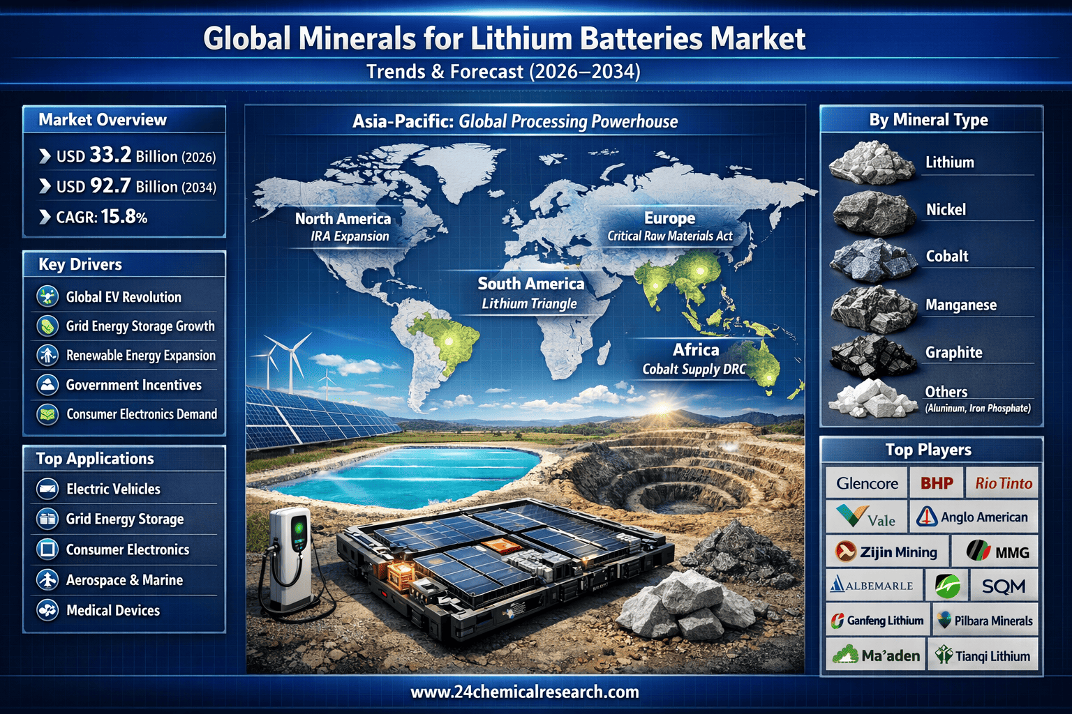 15.8% CAGR Surge: Why Minerals for Lithium Batteries Could Reach USD 92.7 Billion by 2034 Global Minerals for Lithium Batteries Market is entering a phase of unprecedented expansion. Valued at USD 28.5 billion in 2025, the market is projected to grow from USD 33.2 billion in 2026 to USD 92.7 billion by 2034, registering a remarkable 15.8% CAGR, according to 24Chemical Research. This surge is fueled by accelerating electric vehicle (EV) adoption, rapid deployment of grid-scale energy storage, and continuous innovation in consumer electronics. Critical minerals such as lithium, nickel, cobalt, manganese, and graphite form the backbone of lithium-ion battery production, supporting high energy density, performance, and durability. The EV revolution remains the dominant growth engine, with global electrification policies and automaker investments driving exponential mineral demand. Parallel expansion in renewable energy storage systems further strengthens long-term demand visibility. Meanwhile, advancements in battery chemistry—such as lithium iron phosphate (LFP) and high-nickel cathodes—are reshaping mineral consumption patterns. Despite strong growth, the market faces supply chain concentration risks, ESG scrutiny, long mine development timelines, and geopolitical pressures. However, major investments in recycling technologies, vertical integration partnerships, and regional supply diversification are reshaping the competitive landscape. 📥 Download FREE Sample Report: https://www.24chemicalresearch.com/download-sample/269321/global-minerals-for-lithium-batteries-forecast-market-2024-2030-381 🔗 Get Full Report: https://www.24chemicalresearch.com/reports/269321/global-minerals-for-lithium-batteries-forecast-market-2024-2030-381 About 24Chemical Research Providing trusted chemical and materials market intelligence since 2015, serving 30+ Fortune 500 companies worldwide. 📞 Asia: +91 9169162030 🌐 https://www.24chemicalresearch.com/ 🔗 LinkedIn: https://www.linkedin.com/company/24chemicalresearch